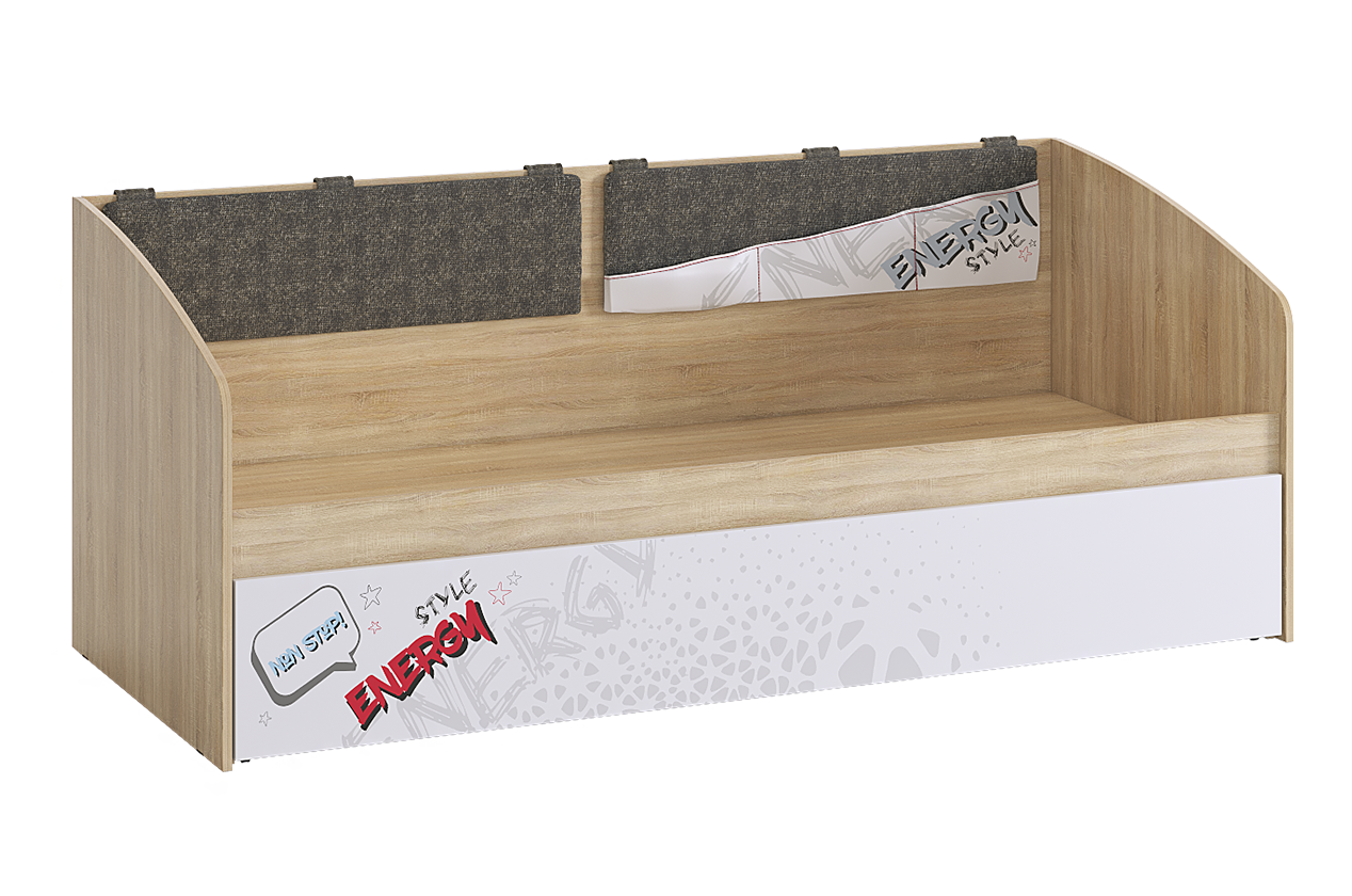 Эта кровать станет ярким элементом интерьера в комнате вашего ребенка. Просторный ящик для хранения белья также может служить дополнительным спальным местом. Мягкие накладки на спинке добавляют уют и комфорт.