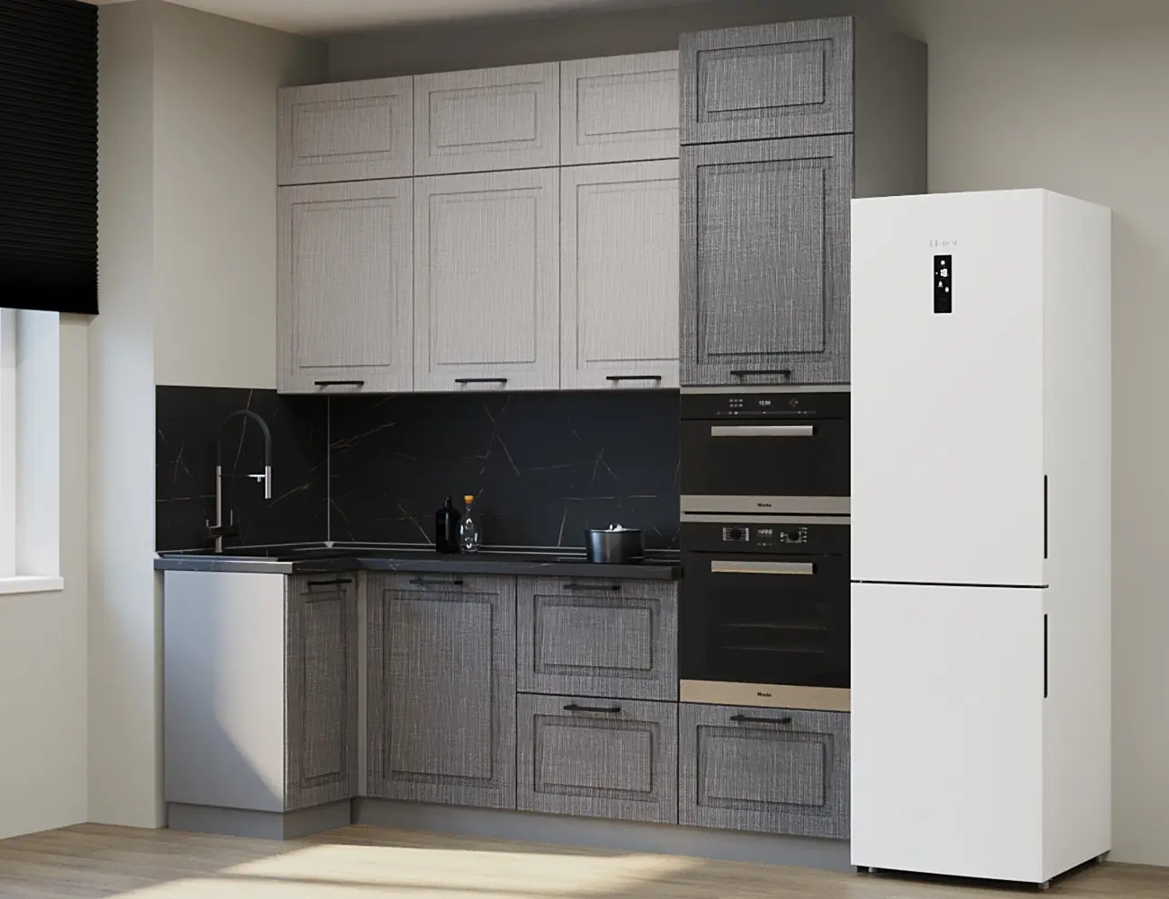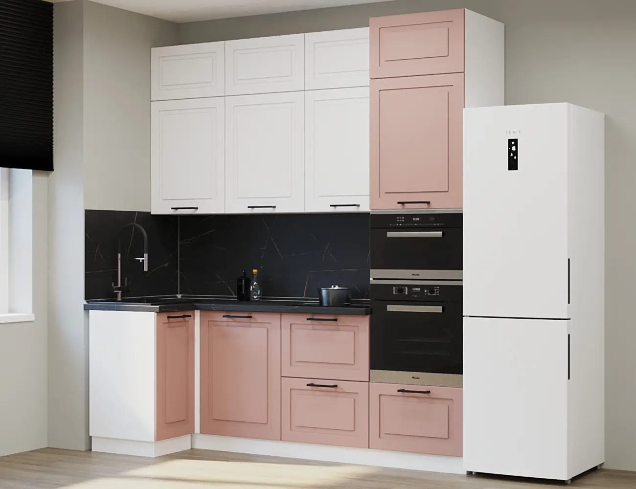 Аликанте 1: Цвет фасада: Шарли Pink, Шарли белый, корпус Серый, столешница 28мм: Каспий черное золото
