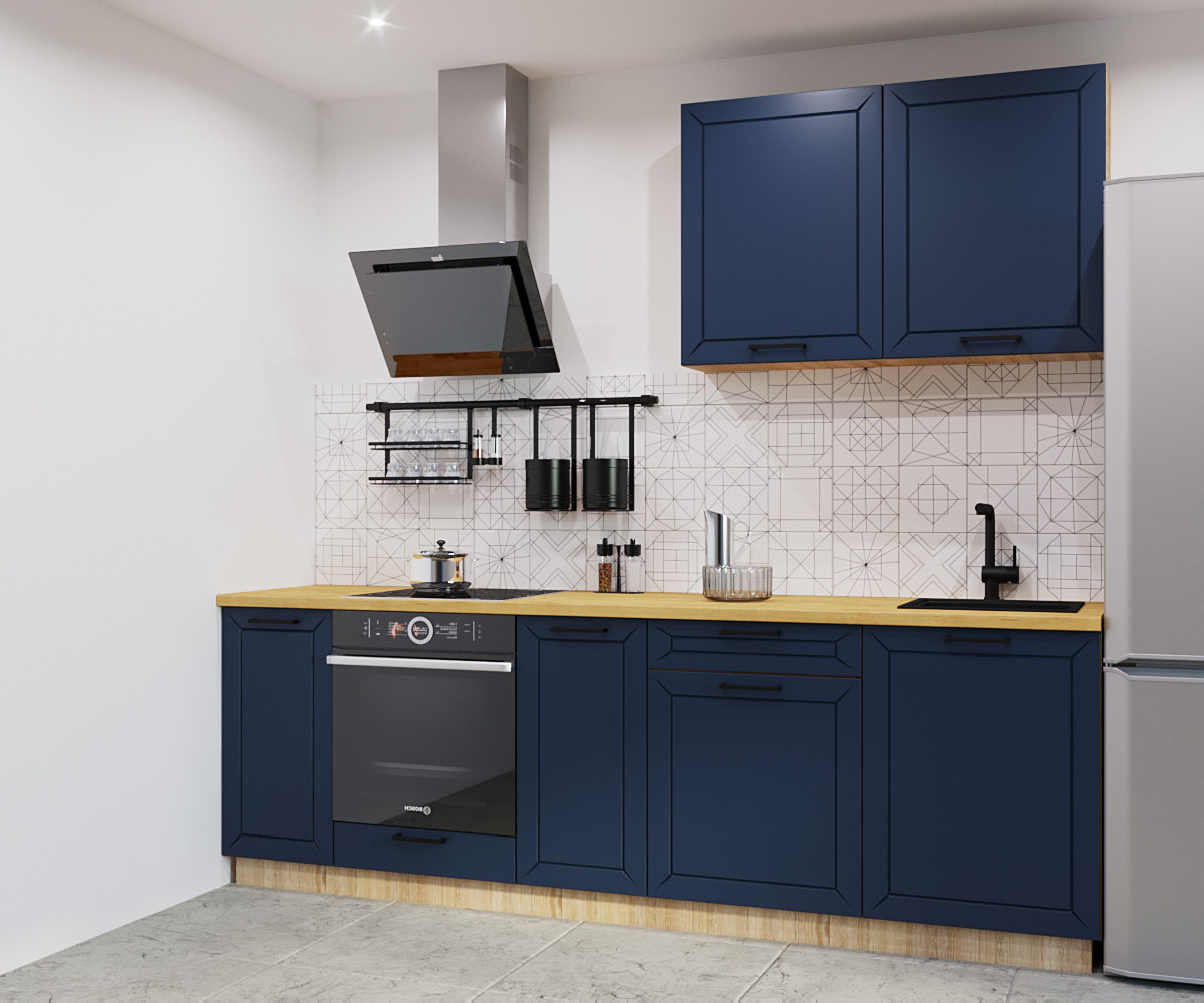 Синяя кухня всегда привлекает к себе восторженные взгляды, преображает окружающую обстановку и делает ее более легкой и свежей. Сдержанный и элегантный тандем в сочетании с грамотно расставленными яркими акцентами, будет смотреться очень уютно. Отличным компаньоном для синего станут корпус и столешница под светлое дерево.