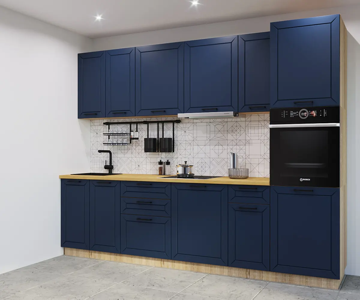 Синяя кухня всегда привлекает к себе восторженные взгляды, преображает окружающую обстановку и делает ее более легкой и свежей. Сдержанный и элегантный тандем в сочетании с грамотно расставленными яркими акцентами, будет смотреться очень уютно. Отличным компаньоном для синего станут корпус и столешница под светлое дерево.
