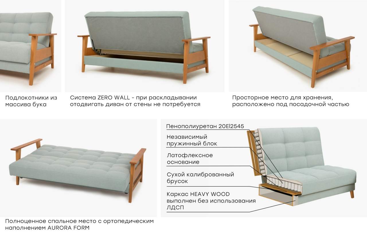 С помощью механизма «книжка» вы сможете легко и быстро разложить диван в кровать. С помощью системыZERO WALL при раскладке отодвигать диван от стены не потребуется. С ортопедическим наполнением AURORA FORM ваш сон будет комфортным и здоровым. Надежный каркас HEAVY WOOD выполнен без использования ЛДСП. Уникальная система SOFT LINE не только придает визуальный стиль, но и обеспечивает пышность и мягкость форм, минимизируя растяжение ткани.