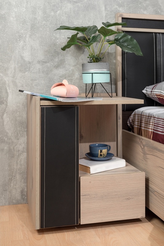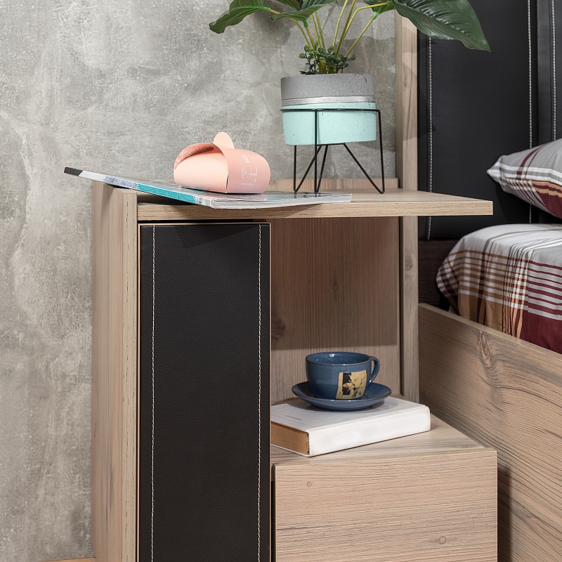 Стильная и практичная Тумба прикроватная 42 не оставит никого равнодушным. Благодаря оригинальному стилистическому решению и вставкам из экокожи черного цвета, тумба смотрится одновременно строго и элегантно. Универсальная конструкция сочетает в себе открытую полку, выдвижной ящик, нишу с дверью на петлях, что очень удобно для хранения вещей, которые так необходимы утром и вечером перед сном. Оптимальная высота прикроватной тумбочки позволит разместить в боковом отделении даже ноутбук.