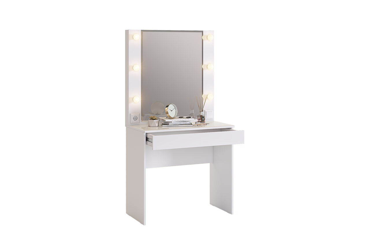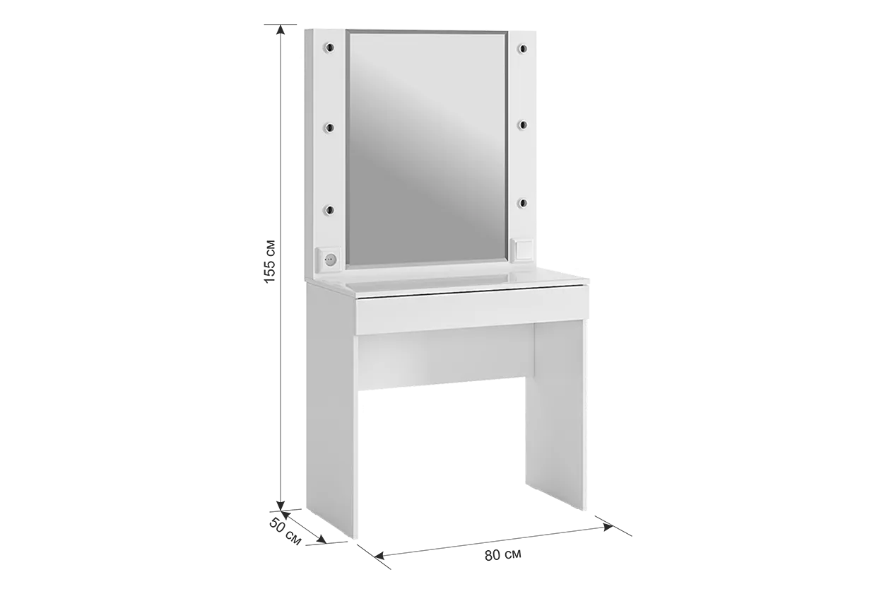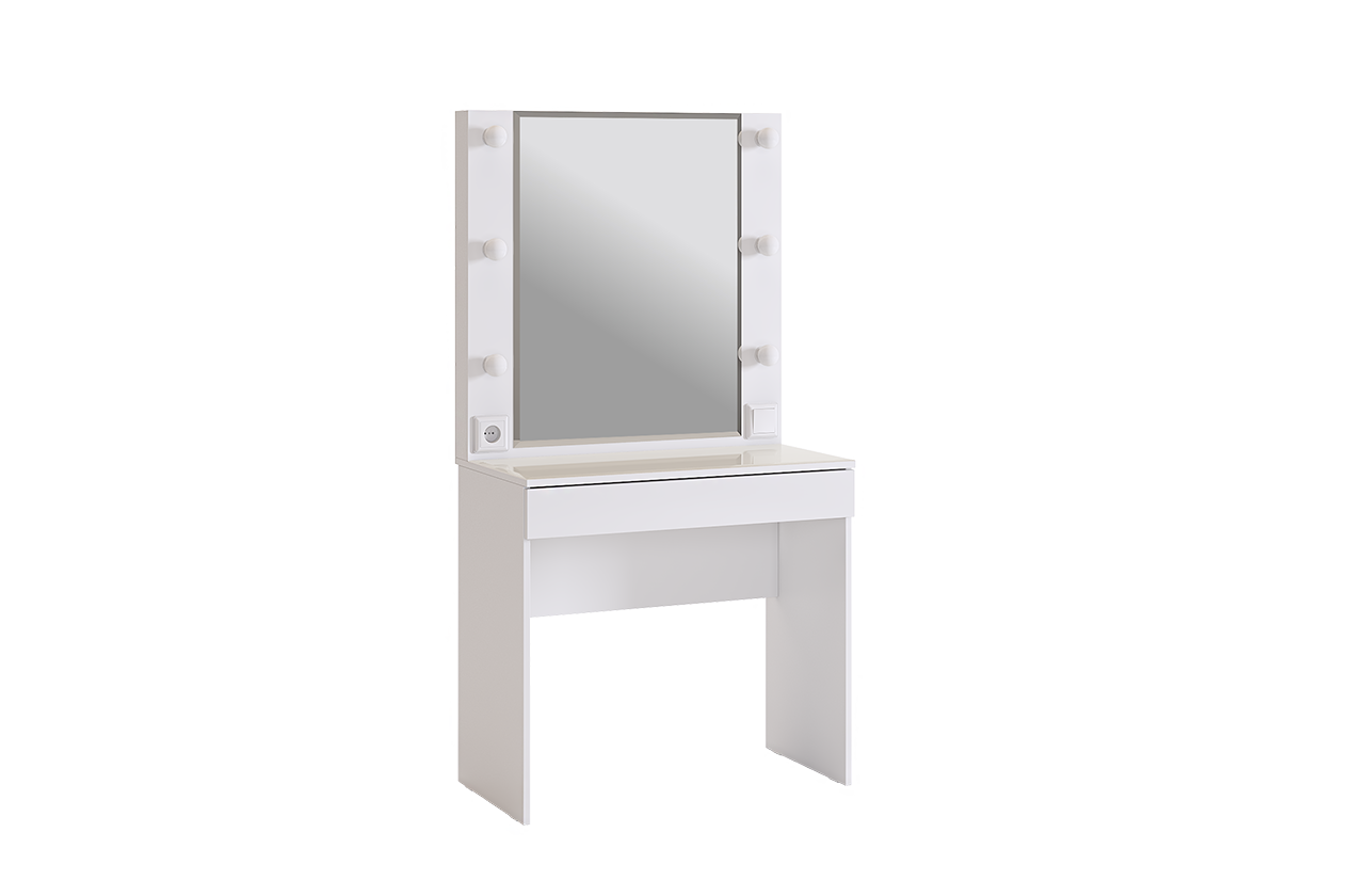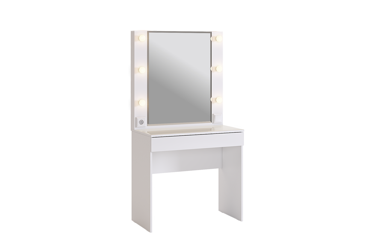 Трюмо Гламур спроектировано, чтобы удовлетворить потребности современной юной леди. С широким зеркалом, яркой подсветкой и просторным ящиком для аксессуаров, это трюмо идеально подходит для каждодневного использования. Дополнительный функционал в виде розетки позволяет без проблем подключить фен или другую косметическую технику. А удобные патроны для ламп, выключатель и длинный провод делают его еще более практичным. Стоит отметить, что лампы в комплектацию не включены.